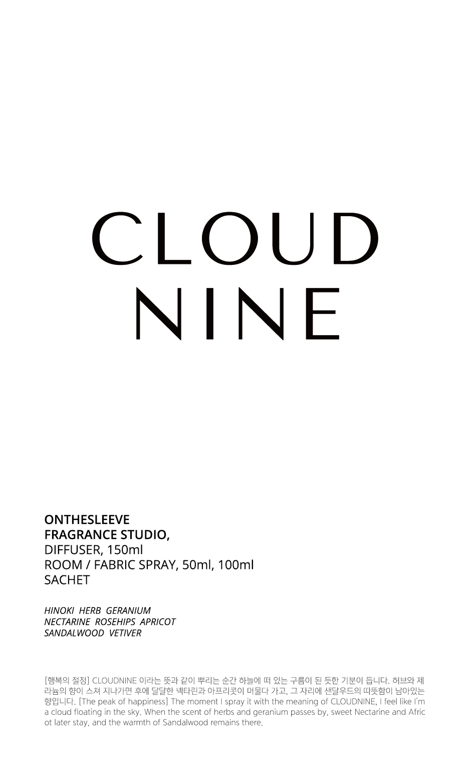 - Fragrance Info : [행복의 절정] Cloudnine 이라는 뜻과 같이 뿌리는 순간 하늘에 떠 있는 구름이 된 듯한 기분이 듭니다. 허브와 제라늄의 향이 스쳐 지나가면 후에 달달한 넥타린과 아프리콧이 머물다 가고, 그 자리에 샌달우드의 따뜻함이 남아있는 향입니다. [The peak of happiness] The moment I spray it with the meaning of CLOUDNINE, I feel like I'm a cloud floating in the sky. When the scent of herbs and geranium passes by, sweet Nectarine and Africot later stay, and the warmth of Sandalwood remains there.