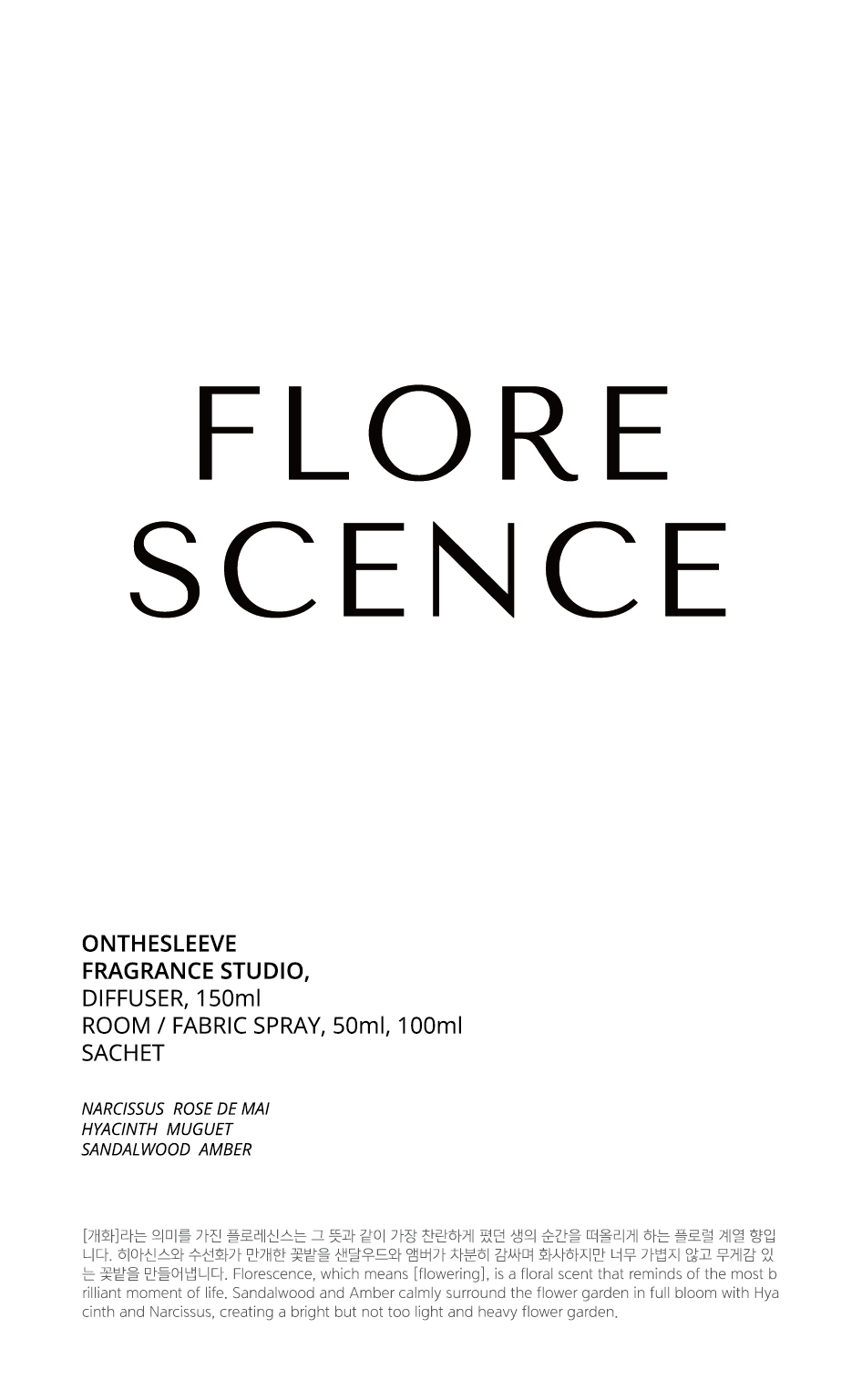 - Fragrance Info : [개화]라는 의미를 가진 플로레신스는 그 뜻과 같이 가장 찬란하게 폈던 생의 순간을 떠올리게 하는 플로럴 계열 향입니다. 히아신스와 수선화가 만개한 꽃밭을 샌달우드와 앰버가 차분히 감싸며 화사하지만 너무 가볍지 않고 무게감 있는 꽃밭을 만들어냅니다. Florescence, which means [flowering], is a floral scent that reminds of the most brilliant moment of life. Sandalwood and Amber calmly surround the flower garden in full bloom with ylang ylang and roses, creating a bright but not too light and heavy flower garden.